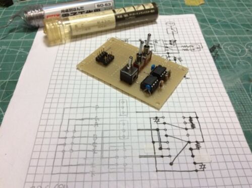 1番上のスイッチで回路の「オン」「オフ」切り替え、 2番目のスイッチで「A連射」「オフ」「B連射」の切り替え、 3番目のスイッチで「↑↓交互連射」「オフ」「←→連射」の切り替えが出来るようになっています。コガネシティの最右列で「オン」「B連射」「↑↓交…